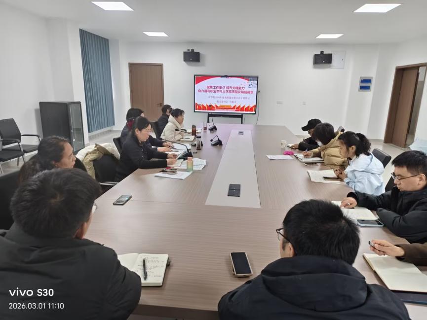 会上,学院党总支书记石继华首先传达了校党委书记马顺圣在学校2026年高质量发展大会上的重要讲话精神:回首2025年,学校砥砺奋进,职业本科建设实现历史性突破,在党建引领、内涵建设、立德树人、社会服务、开放合作、队伍建设等方面取得显著成效;展望2026年,学校将聚焦重点,加快建设新时代高水平职业技术大学,强化政治引领,深化立德树人,优化专业布局,加强师资队伍建设,深化产教融合,加强校园建设,开展合作交流。面对“十五五”新形势新任务,要把握关键,奋力谱写职业本科大学高质量发展新篇章。