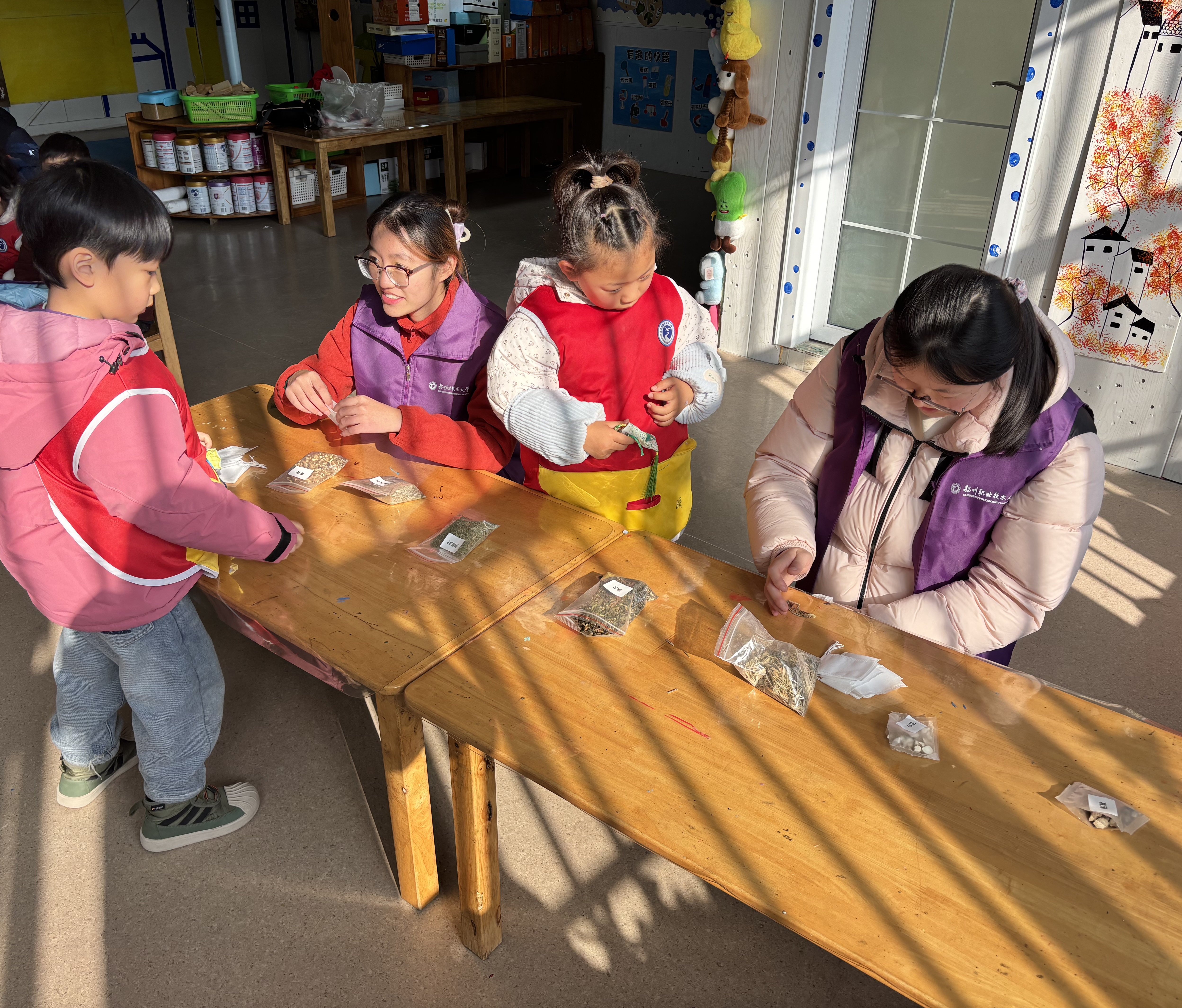 手工制作环节格外受到孩子们的喜爱。社团成员提前准备了艾草、丁香等天然香料以及各式各样的香囊布袋,引导孩子们自主选择喜欢的香料。“艾草有驱虫的作用”“大家可以试着调配不同的香味”,庄娴一边讲解各种香料的传统用途,一边示范如何将香料装入香囊。孩子们穿绳、装料、封口,亲手制作出一个个小巧精致、香气清雅的平安香囊。在动手实践中,他们不仅感受到传统中医药文化的魅力,也寄托了对健康与平安的美好祝愿。