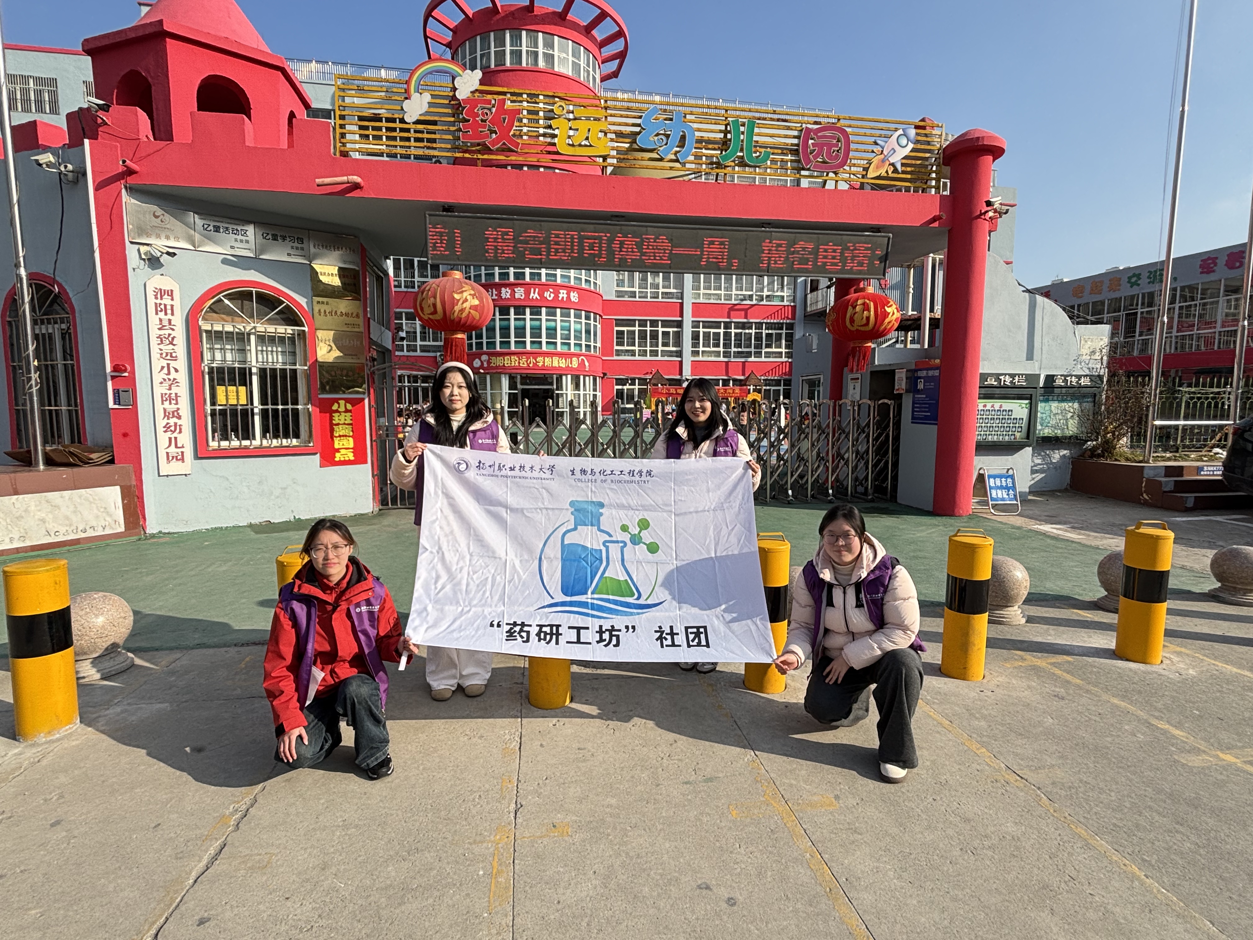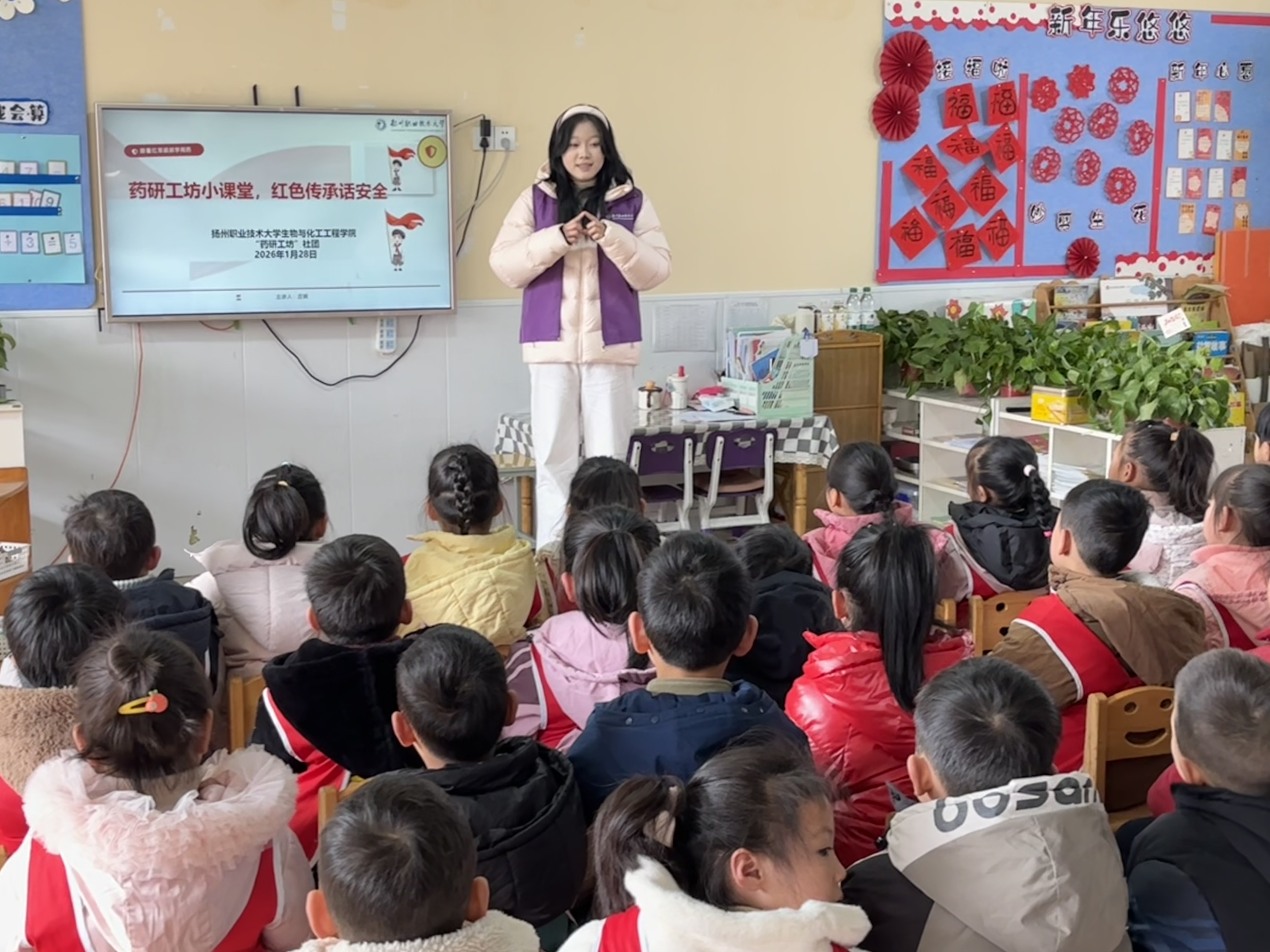 寒假期间,扬州职业技术大学生物与化工工程学院“药研工坊”社团的宿迁籍学生返回家乡宿迁市泗阳县,走进致远幼儿园,开展了以“药研工坊小课堂,红色传承话安全”为主题的社会实践活动。社团成员们结合药品生产技术专业特长,将红色文化与用药安全知识相融合,为孩子们带来了一堂生动有趣的知识普及课。