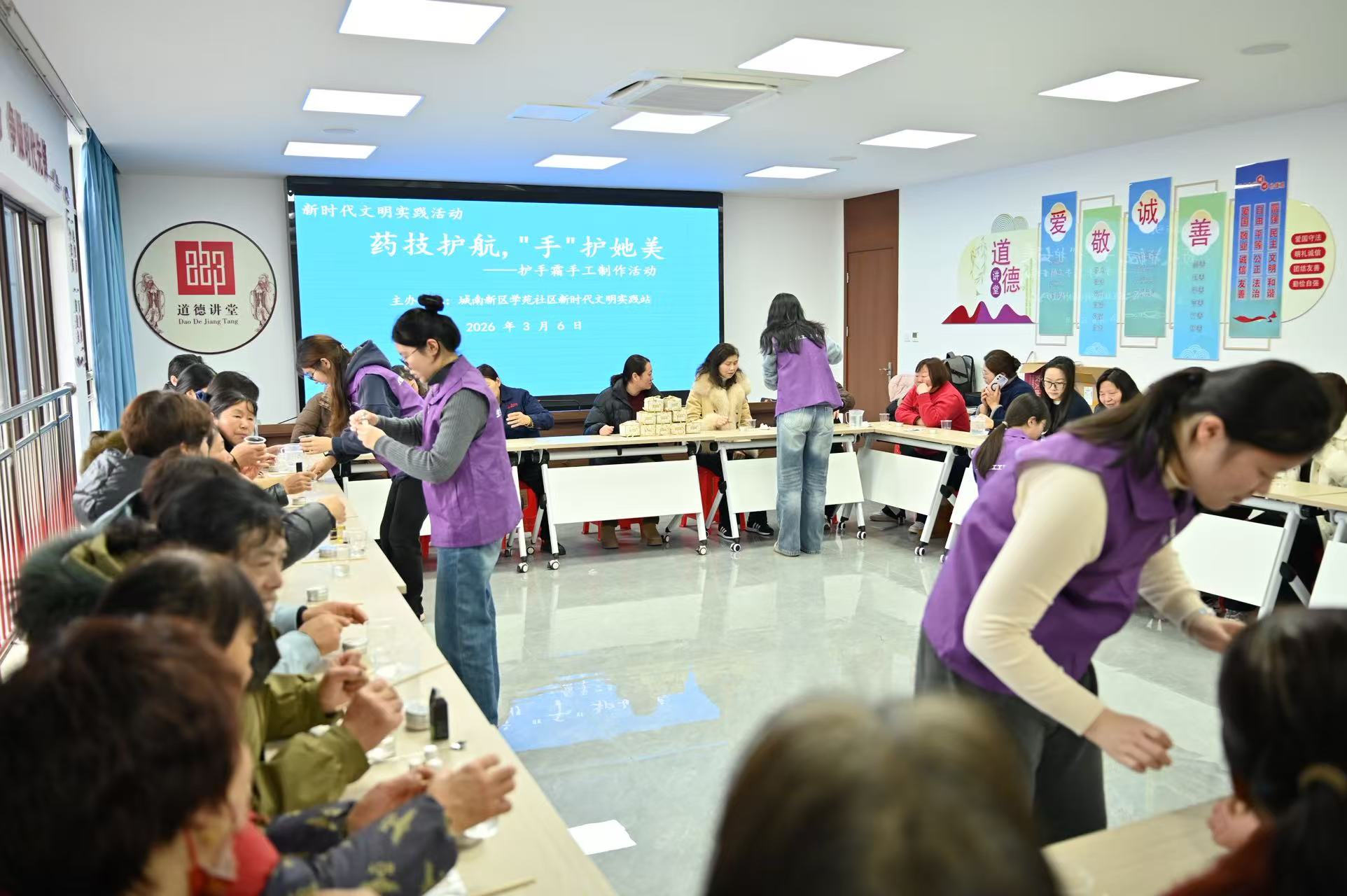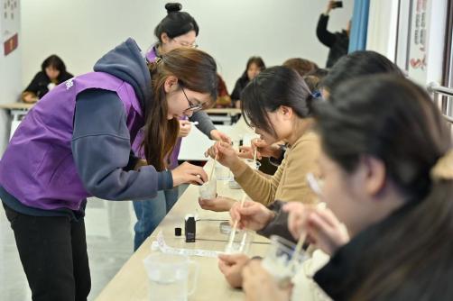 科普分享后,手工护手霜DIY环节拉开帷幕,成为现场最受居民欢迎的环节。庄娴等5名志愿者化身指导老师,以药厂乳膏生产工艺为蓝本,将药品专业知识融入实操教学。从75%医用酒精消毒器具,到油水两相制备、同向混合搅拌,再到低温添加精油、冷却灌装、包装贴标,志愿者对每个步骤细致讲解示范,还为居民解读植物油、乳化剂等核心材料的作用原理,并进行一对一指导。居民们围在一起动手操作,现场氛围温馨热烈。“第一次亲手做护手霜,“小老师”们教得特别仔细,不仅做出了无酒精、无**的专属护手霜,还弄明白了制作的科学原理,太有收获了!”社区居民王阿姨捧着自制的护手霜笑着说,这样的活动有趣又有料,让这个三八节过得别样有意义,希望社区以后能多开展这类实用的公益活动。