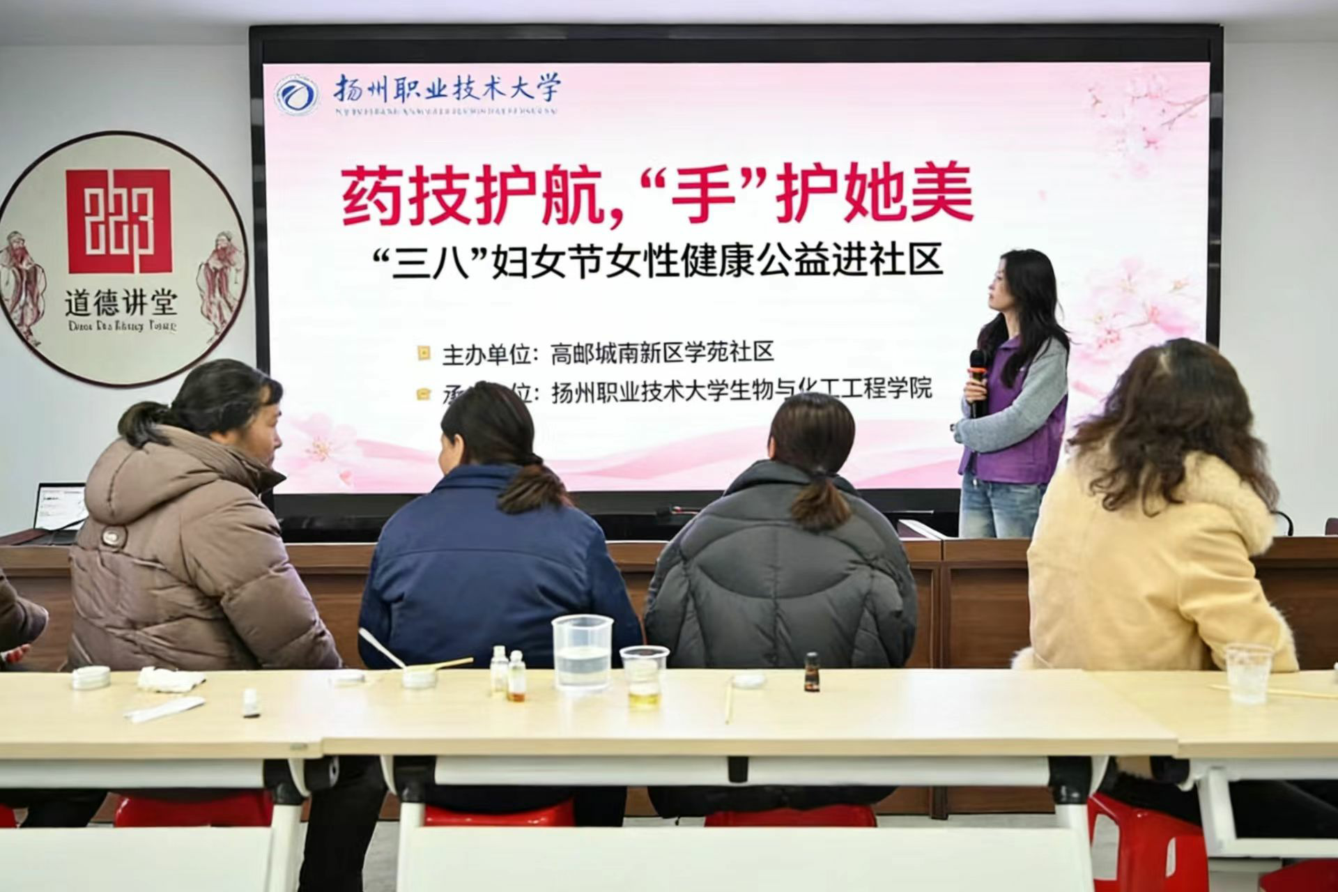 三八国际妇女节前夕,扬州职业技术大学生物与化工工程学院“药研工坊”社团的党团积极分子,在学工党支部的指导带领下走进高邮城南新区学苑社区,开展“药技护航,‘手’护她美”女性健康公益活动。学生们将药品专业知识转化为暖心服务,为社区女性送上专业的健康指导与趣味实操体验,让大家在节日氛围中收获健康知识,度过一个别样且有意义的三八节,也进一步深化了校社共建的良好合作模式。