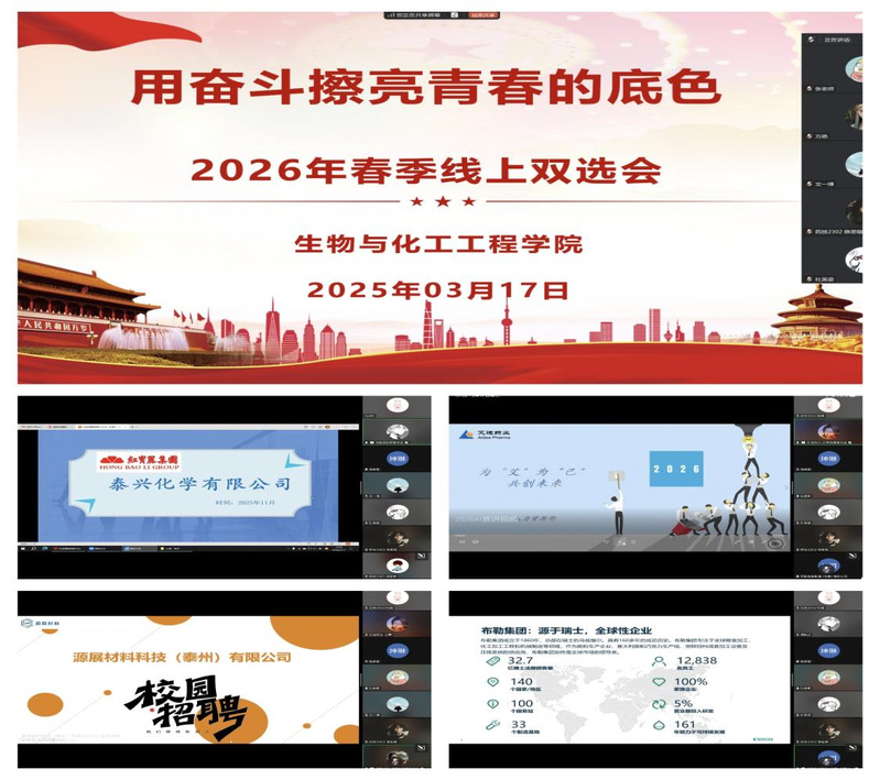 近日,生物与化工工程学院2026年春季线上双选会顺利举办。活动以“用奋斗擦亮青春的底色”为主题,吸引了红宝丽集团泰兴化学有限公司、布勒食品制造(无锡)有限公司、江苏艾迪药业集团股份有限公司、源展材料科技(泰州)有限公司等多家行业知名企业参会,面向学院毕业生提供多元化就业岗位50个。